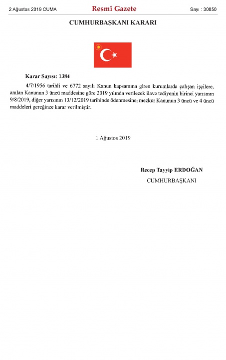 2019 yılı İlave Tediye tarihleri 02.08.2019 tarih ve 30850 sayılı Resmi Gazete'de yayımlandı...