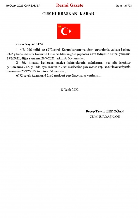 İlave Tediye tarihleri; 19 Ocak 2022 tarih ve 31724 sayılı Resmi Gazete'de yayımlandı...